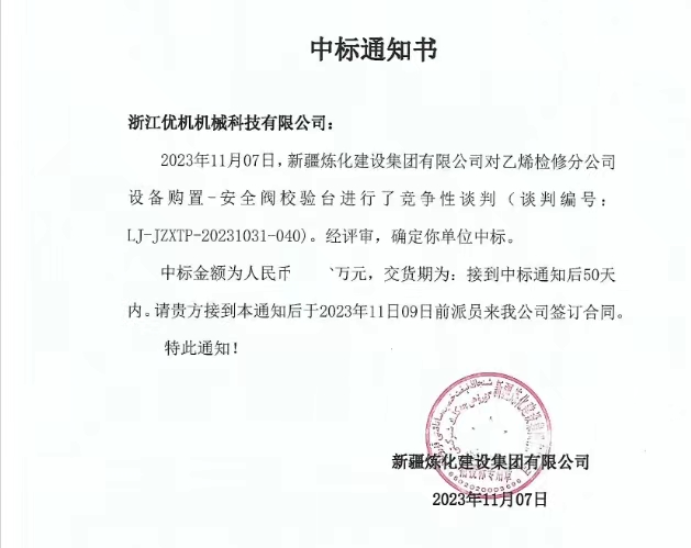 優(yōu)機(jī)機(jī)械科技 >> 新聞中心 >> 公司中標(biāo)中石油新疆煉化建設(shè)集團(tuán)閥門試驗(yàn)校驗(yàn)項(xiàng)目